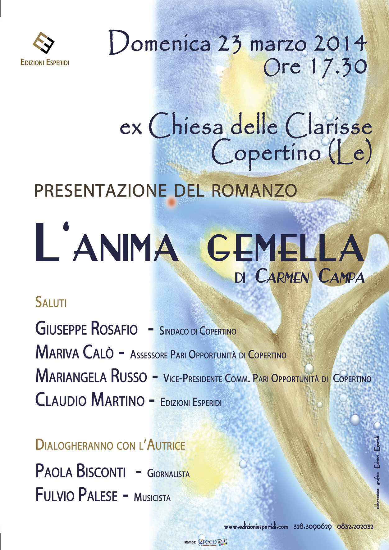 Domenica 23 Marzo 2014 alle ore 17.30, nella Chiesa delle Clarisse, la scrittrice Carmen Campa presenterà il suo romanzo dal titolo: "L'Anima Gemella". Seguirà un dibattito sulla condizione della...