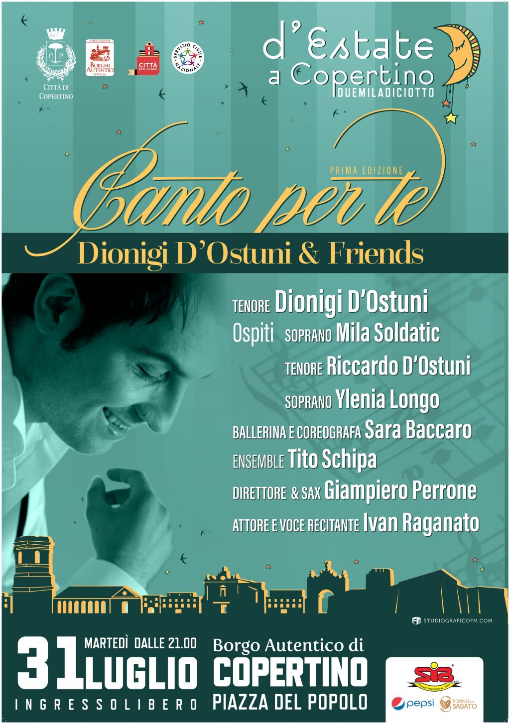 Per la Rassegna "D'Estate a Copertino organizzata dall'Amministrazione Comunale un grande ritorno quello di Dionigi D’ Ostuni nella sua Città! “ Canto per te” il titolo del suo spettacolo che è tutto un programma, un programma vasto e completo perché con la sua voce duttile e versatile, calda, piena e potente, il tenore, spazierà dal repertorio della musica lirica con arie tratte dalle più famose opere del ricco patrimonio italiano, ma anche internazionale, alle canzoni contemporanee che hanno lasciato il segno nella storia della musica italiana! Accompagna l’ artista il collaudato Ensemble Tito Schipa del sassofonista Giampiero Perrone, compositore tra l’ altro di nuovi brani inediti che ascolteremo la sera del 31 Luglio a Copertino in piazza del Popolo alle ore 21:00. Sul palco duetterà con il soprano croato Mila Soldatic, con l’ altro tenore copertinese, nonché fratello Riccardo D’ Ostuni, con un’ altra splendida voce, quella di Ylaria Longo e il cantautore Flavio Leo. Arricchiranno lo spettacolo le coreografie di Sara Baccaro e da artista completo qual è non poteva farsi mancare il teatro con gli attori di Scena Muta, Dalila Grandioso, Mauro Martina e Luana Chiriatti. Conduce la serata Ivan Raganato, al quale lo lega profonda stima e amicizia, che con la sua verve saprà come “ catturare” tutto il pubblico per tutta la durata dello spettacolo.