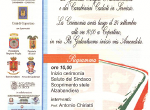 Cerimonia d’inaugurazione stele in onore del Generale Angelo Nannavecchia – Via Re Galantuomo inizio via Amendola – Sabato 24 Settembre 2016, ore 10.00 – (Leggere l’allegato)