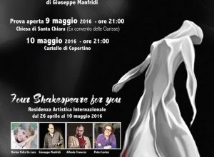 Per il progetto "Residenza Artistica Internazionale", si concluderà presso la Chiesa Santa Chiara (Ex Convento delle Clarisse) il 09 maggio 2016, ore 21.00, la prova aperta ad allievi attori frequentanti scuole di recitazione del territorio pugliese, e il 10 maggio - ore 21.00 presso il Castello di Copertino si svolgerà CHARACTERS UNDER THE SKIN - PER AMORE DI OTELLO di Giuseppe Manfridi.