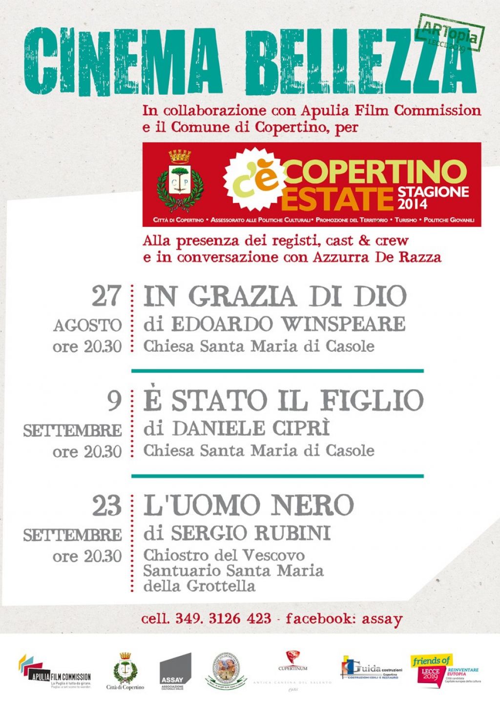 Con l'ormai atteso appuntamento di CINEMA BELLEZZA - un cinema inesistente per davvero che però si materializza all'improvviso, in un luogo insolito, un bene comune, un quartiere della Città di Copertino, ASSAY, in collaborazione con Apulia Film Commission e Comune di Copertino, propongono nelle periferie della Città un ciclo di tre proiezioni di pellicole girate in Puglia.