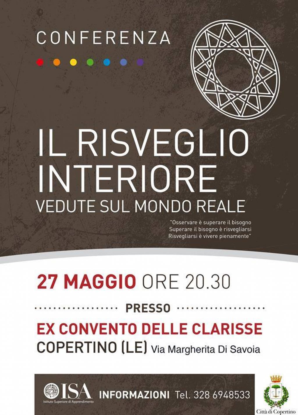 Si terrà Mercoledì 27 Maggio alle 20.30 presso l'ex Convento delle Clarisse a Copertino la Conferenza dal titolo "Il risveglio Interiore" organizzata da ISA - Istituto Superiore di Apprendimento.