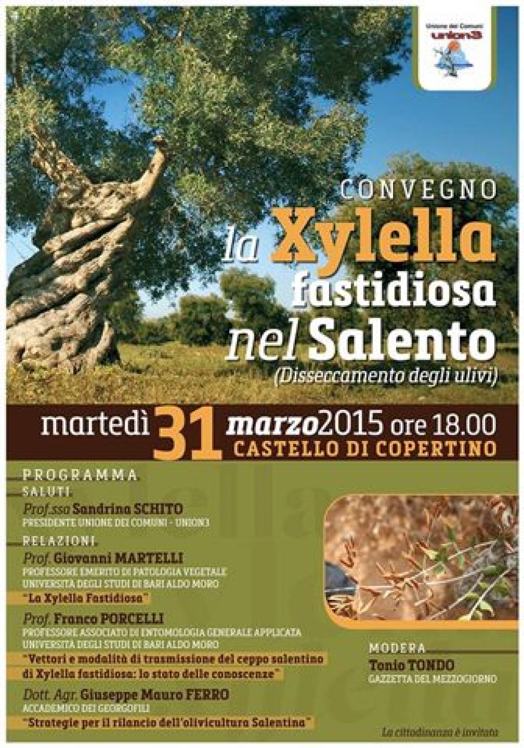 Martedì 31 Marzo 2015, ore 18.00, presso il Castesso di Copertino, Convegno sulla Xylella fastidiosa nel Salento (Disseccamento degli ulivi). Leggere manifesto allegato