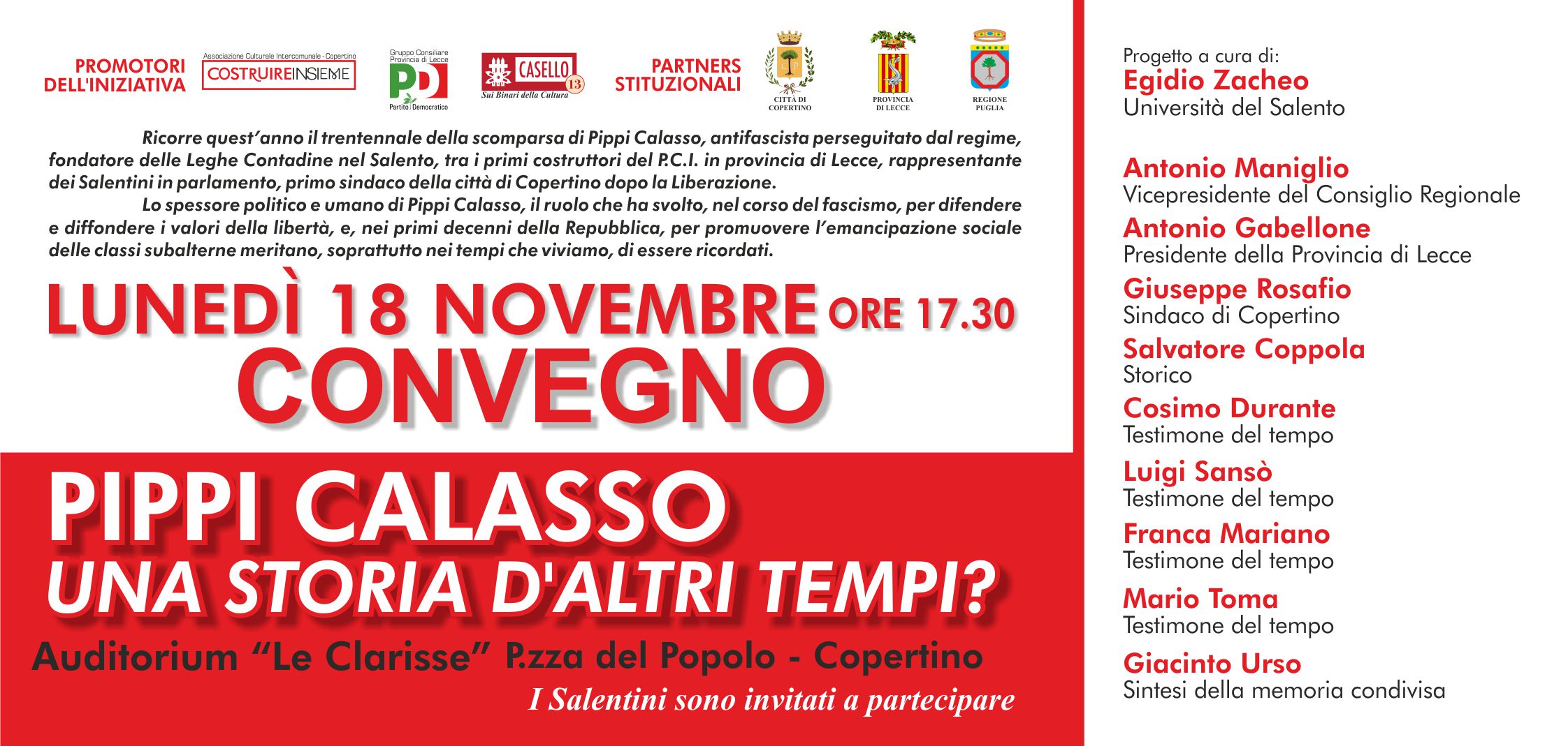 Il Convegno, che ricorderà l'On. Giuseppe Calasso nel trentennale della sua scomparsa, si terrà Lunedì 18 Novembre alle ore 17,30, presso l'Auditorium delle Clarisse di Copertino. L'iniziativa...