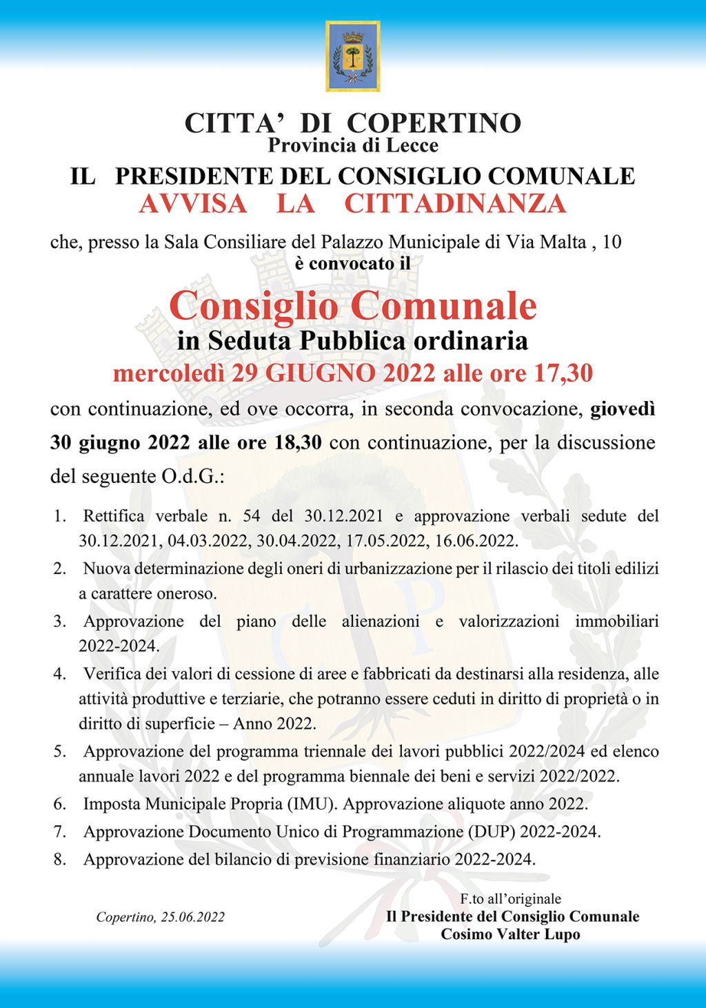Convocazione del Consiglio Comunale