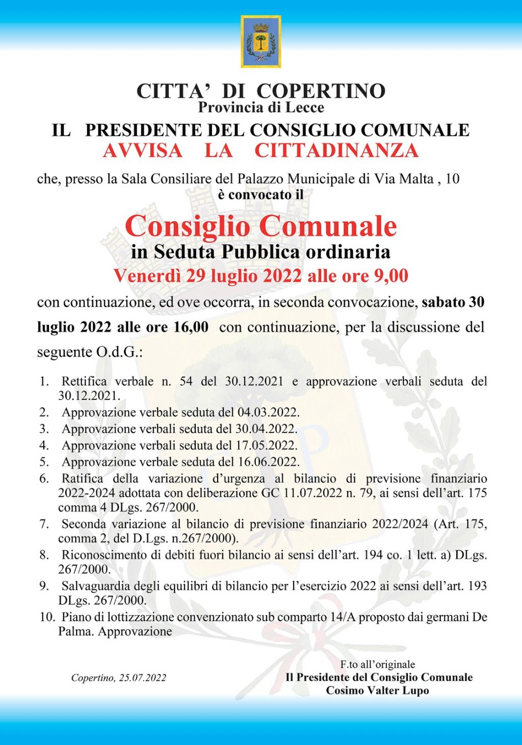 Convocazione del Consiglio Comunale