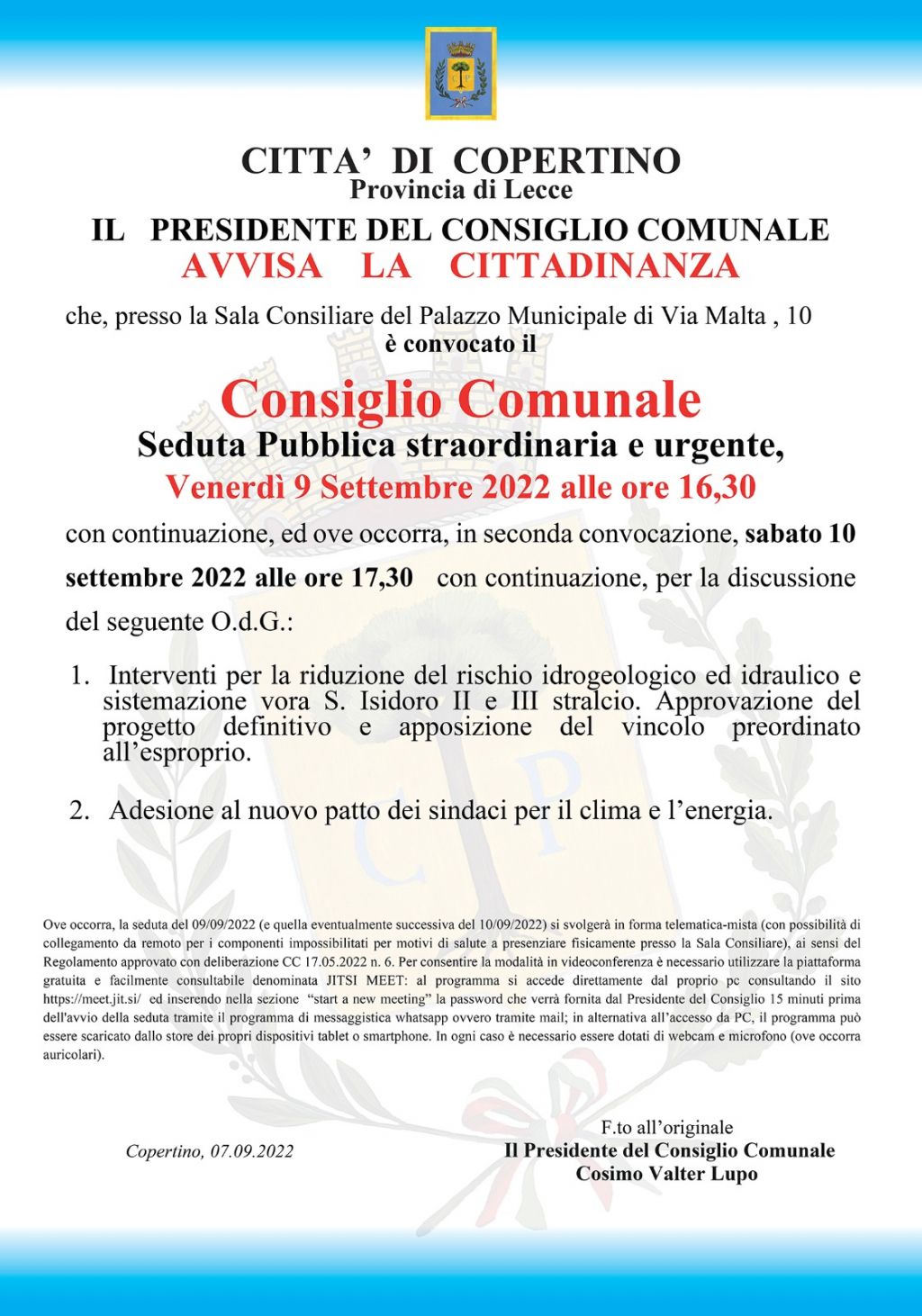 Si comunica che a causa di un guasto improvviso intervenuto sulla webcam installata nella sala consiliare, oggi non sarà garantita la trasmissione via streaming dela seduta di Consiglio Comunale. Al contrario, sarà possibile ascoltare la stessa sintonizzandosi sulle frequenze radiofoniche di Radio non Tacere di Copertino, che come di consueto trasmetterà in diretta la seduta consiliare.
