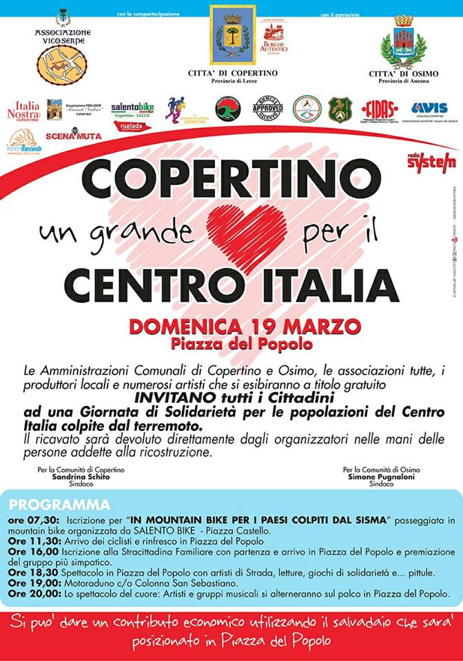 Domenica 19 marzo 2017, in Piazza del Popolo a Copertino, in occasione della Festività di S. Giuseppe Patriarca, le Amministrazioni Comunali di Copertino e Osimo, le associazioni tutte, i produttori locali e numerosi artisti, hanno organizzato una giornata di solidarietà per le popolazioni del Centro Italia recentemente colpite dal terremoto, al fine di raccogliere fondi per sostenere la ricostruzione delle zone colpite, devolvendo quanto raccolto al Comune di S. Ginesio in Provincia di Macerata, nelle mani del Sindaco.