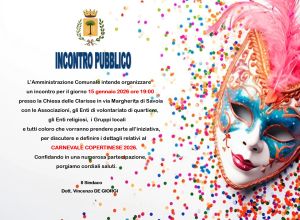 L’Amministrazione Comunale intende organizzare un incontro per il giorno 15 gennaio 2026 ore 19:00 presso la Chiesa delle Clarisse in via Margherita di Savoia con le Associazioni, gli Enti di volontariato di quartiere, gli Enti religiosi, i Gruppi locali e tutti coloro che vorranno prendere parte all’iniziativa, per discutere e definire i dettagli relativi al CARNEVALE COPERTINESE 2026.