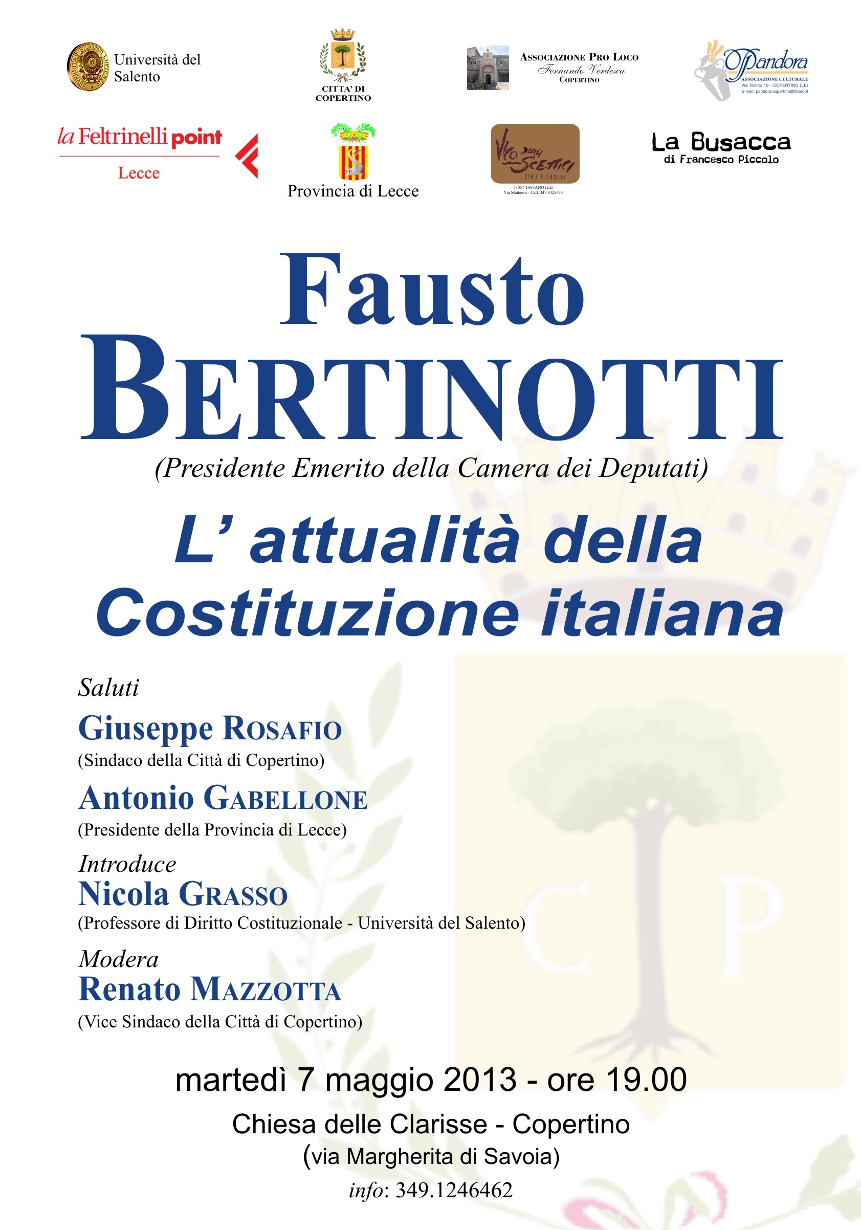 Martedì 7 Maggio 2013 alle ore 19,00 ci sarà un incontro con Fausto Bertinotti durante il quale si discuterà dell'attualità della Costituziome Italiana. Leggere manifesto allegato.