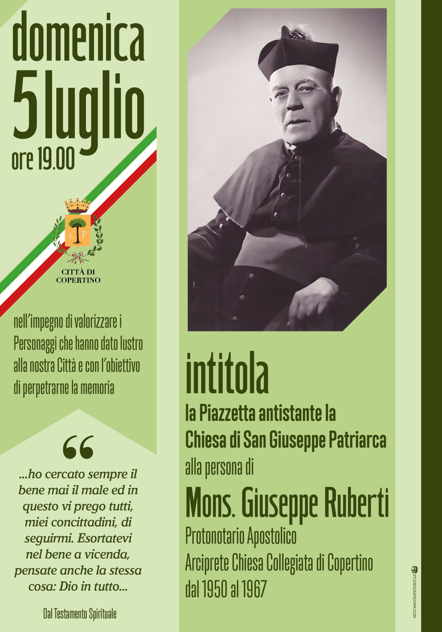 L'Amministrazione Comunale, invita i cittadini  Domenica 5 luglio 2015, alle ore 19.00, alla cerimonia di intitolazione della Piazzetta antistante la Chiesta di San Giuseppe Patriarca a Mons....