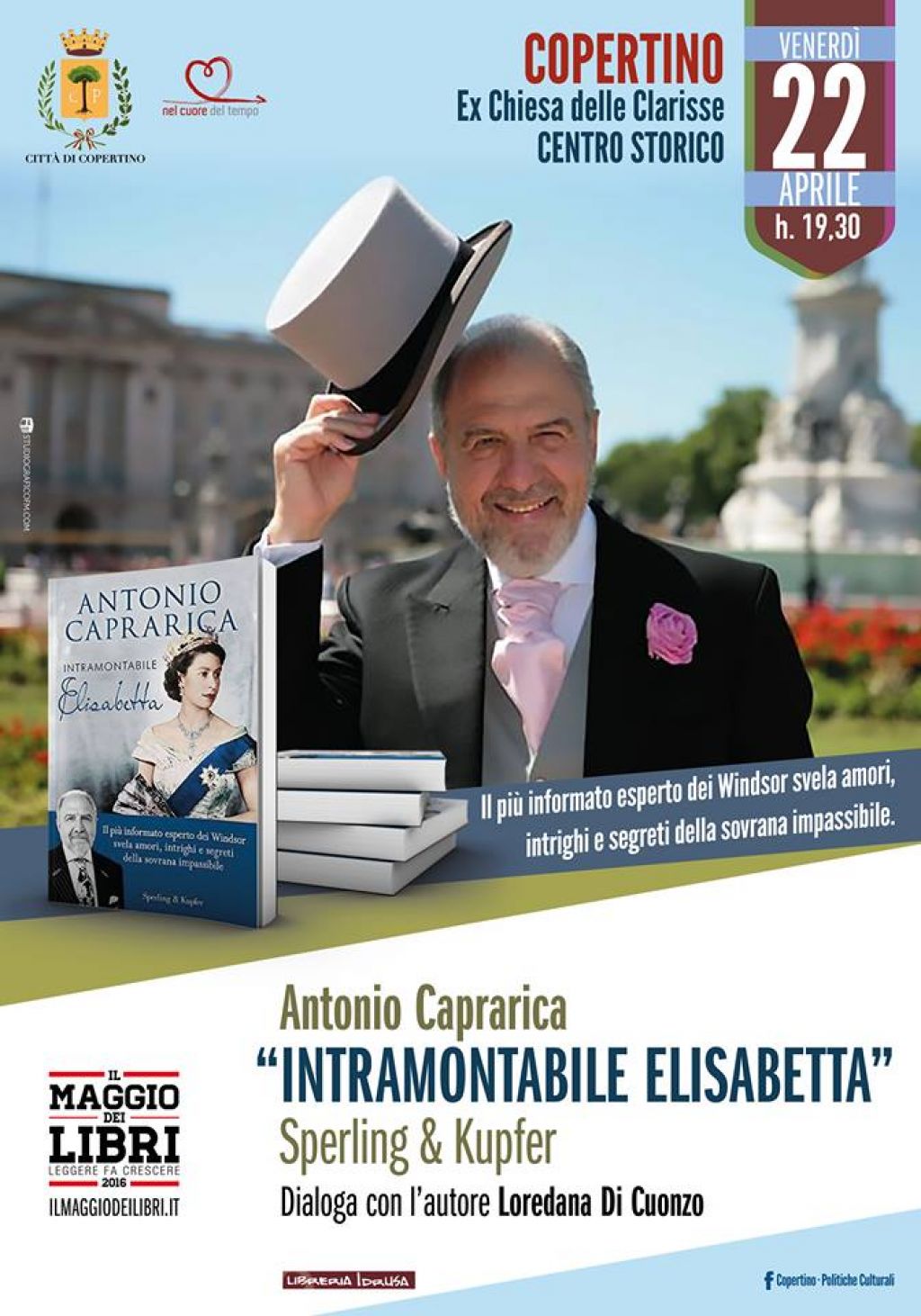 Venerdì 22 Aprile 2016, ore 19.30, presso l'ex Chiesa delle Clarisse, il giornalista Antonio Caprarica presenterà il libro "INTRAMONTABILE ELISABETTA". Invito a partecipare.