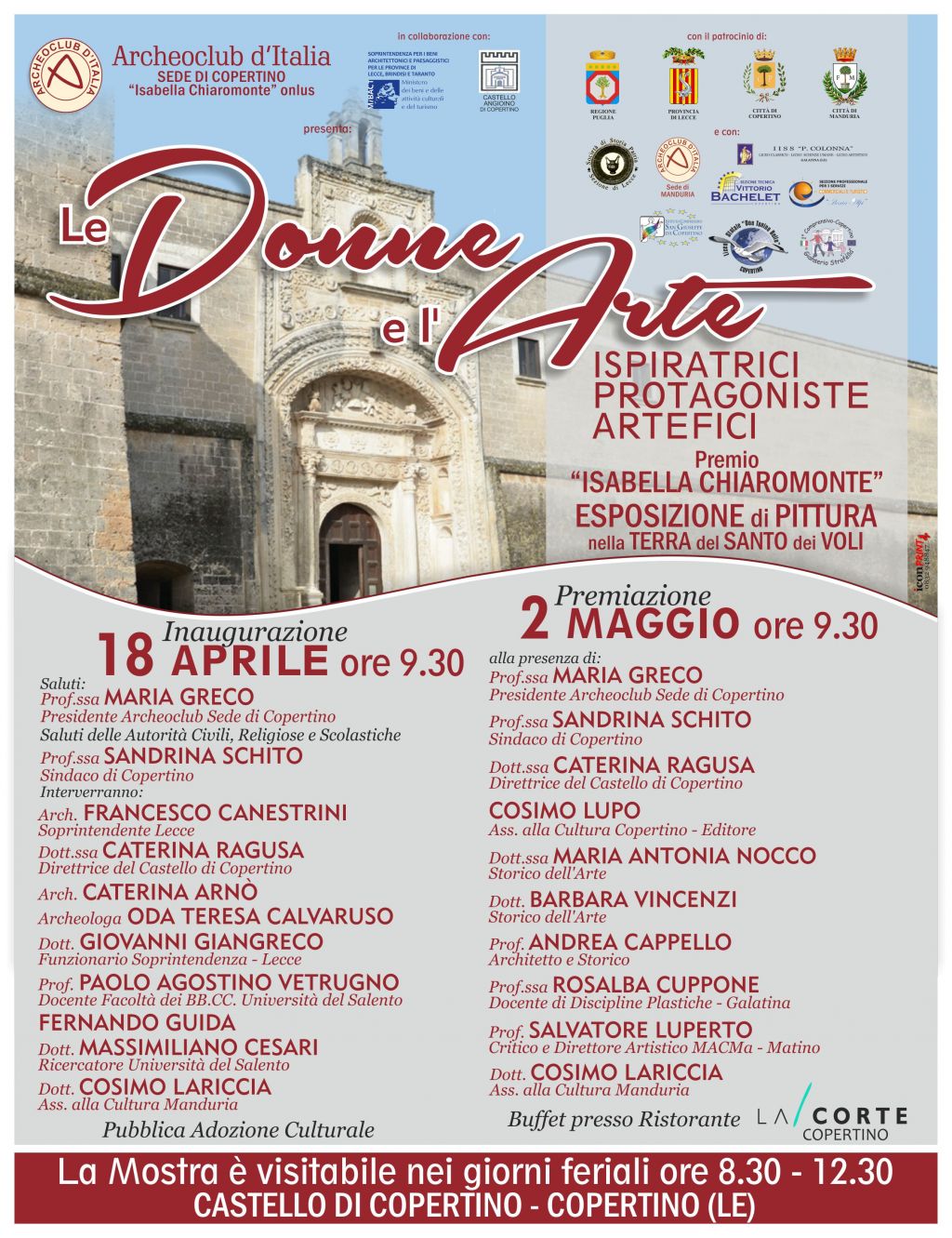 "Le Donne e l'Arte" Ispiratrici, Protagoniste, Artefici. Premio "Isabella Chiaromonte". Esposizione di pittura nella terra del Santo dei Voli nel Castello di Copertino. La Mostra  sarà...