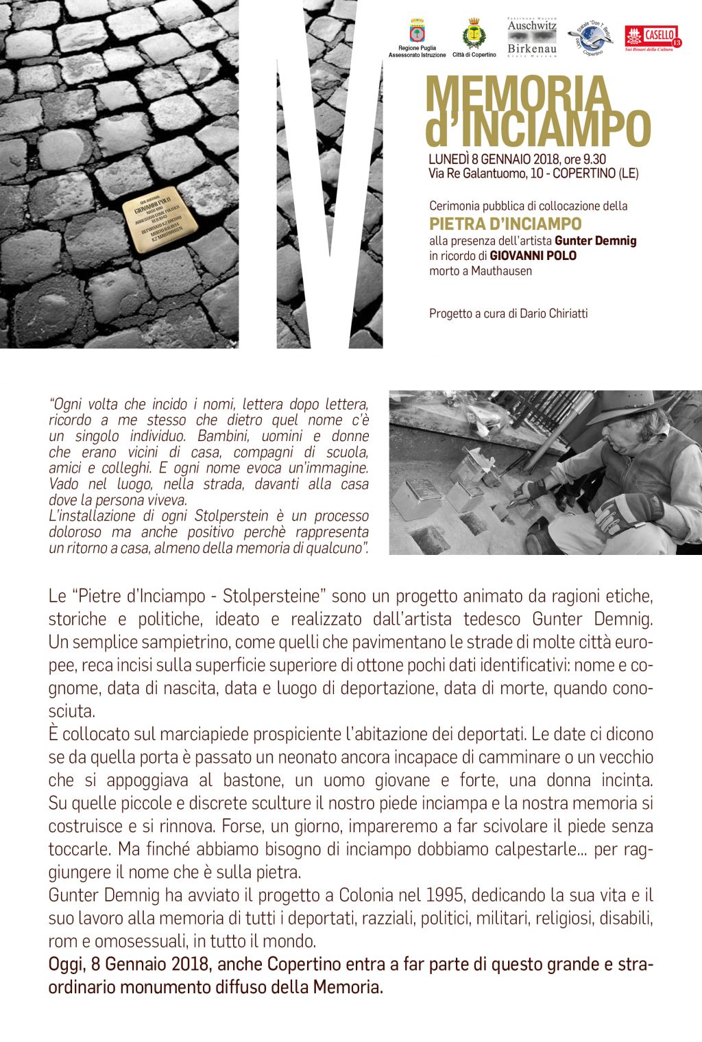 Lunedì 8 gennaio 2018, ore 09.30, in via Re Galantuomo, n. 10 a Copertino (LE), si svolgerà la cerimonia pubblica di collocazione della PIETRA D'INCIAMPO alla presenza dell'artista Gunter Demnig, in ricordo di Giovanni Polo, morto a Mauthausen.