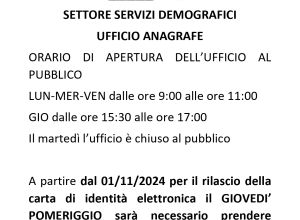 ORARIO SPORTELLO UFFICIO ANAGRAFE