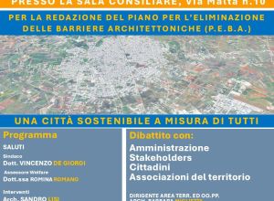 Il primo incontro di presentazione del PEBA si terrà il giorno 07.10.2025, alle ore 18,00 presso la Sala Consiliare di via Malta, 10 alla presenza del sindaco e dell’assessore alle politiche sociali per illustrare contenuti e obiettivi del PEBA (Piano Eliminazione delle Barriere Architettoniche) al fine di raccogliere suggerimenti utili alla predisposizione del Piano.