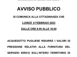 Riduzione pressione idrica per il giorno 6 febbraio 2023
