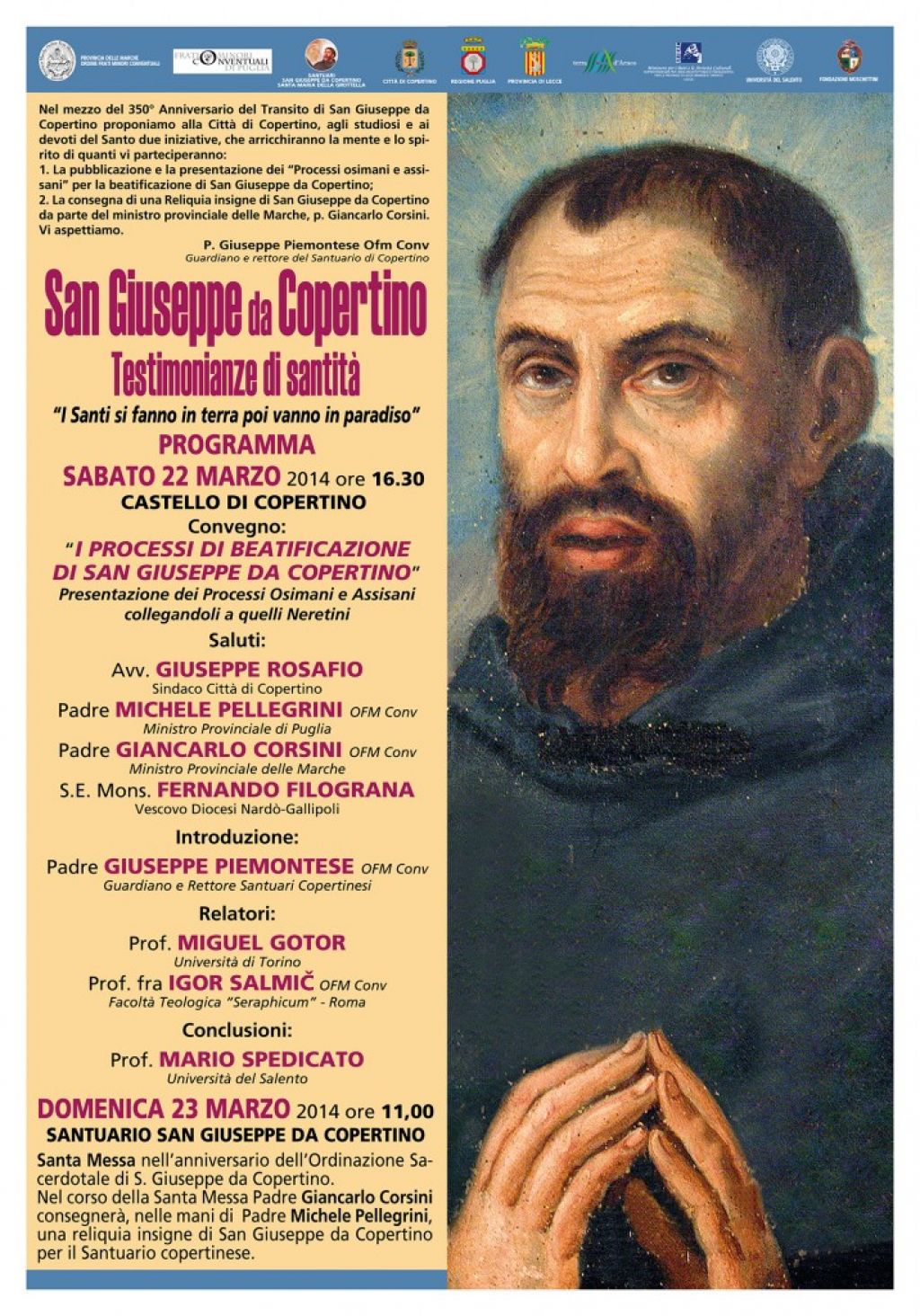 San Giuseppe da Copertino – Testimonianze di Santità – I Santi si fanno in terra poi vanno in Paradiso - Sabato 22 Marzo 2014, ore 16.30, presso il Castello di Copertino.