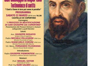 Sabato 22 Marzo 2014, alle ore 16.30, presso il Castello di Copertino, ci sarà un Convegno sul tema: "I Processi di Beatificazione di San Giuseppe da Copertino" – Saranno presentati i Processi...