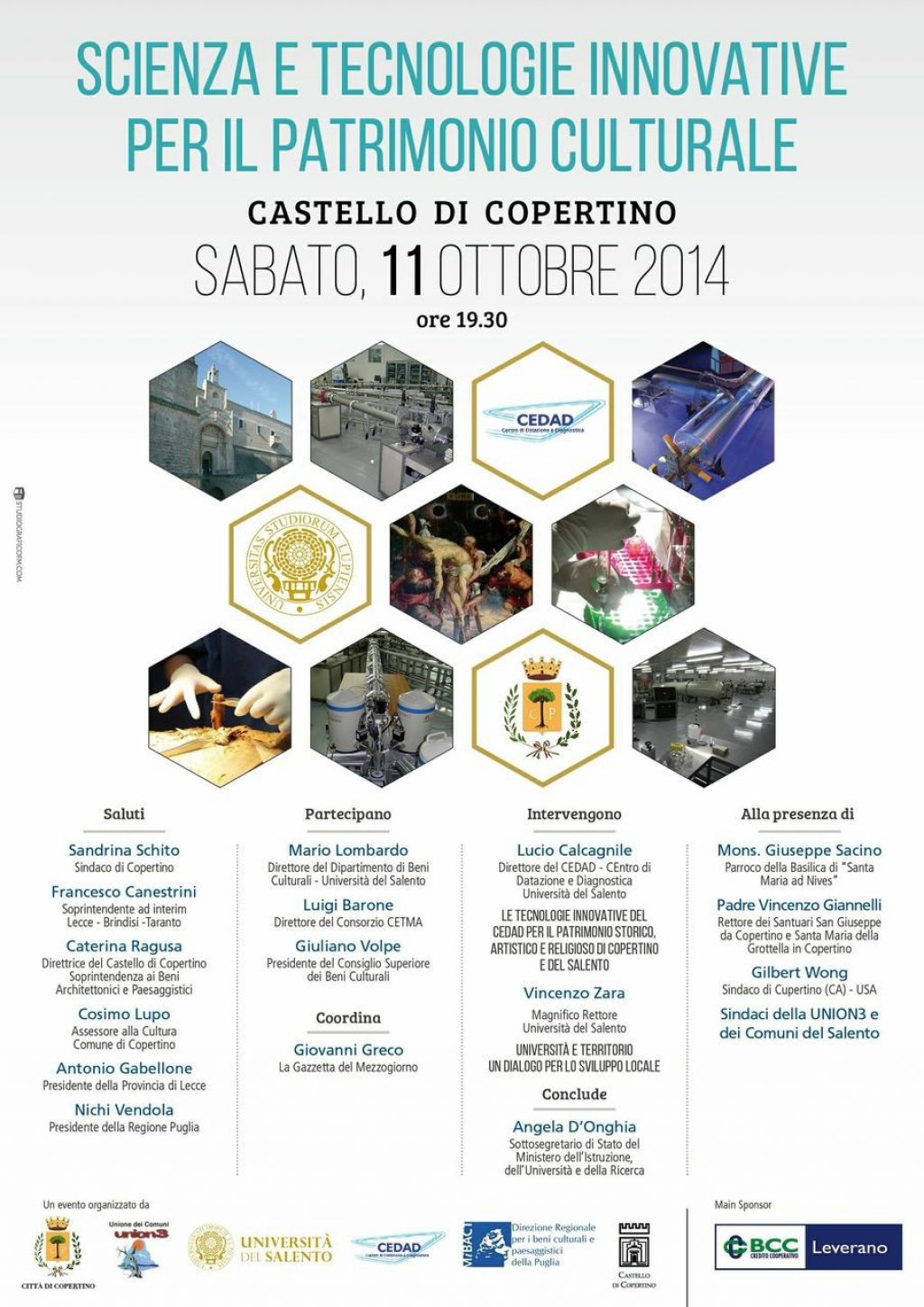 Sabato 11 Ottobre 2014, alle ore 19.30, presso il Castello di Copertino, si svolgerà un Convegno sul tema "SCIENZA E TECNOLOGIE INNOVATIVE PER IL PATRIMONIO CULTURALE". Leggere locandina allegata.