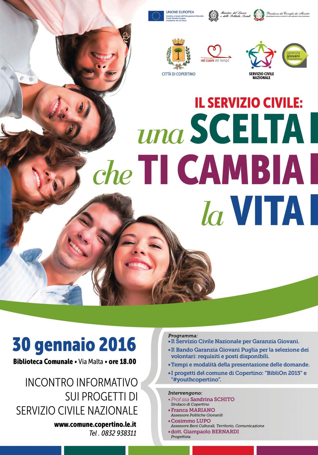 IL SERVIZIO CIVILE UNA SCELTA CHE TI CAMBIA LA VITA Incontro informativo sui progetti di Servizio Civile Nazionale Sabato 30 gennaio 2016 ore 18.00 Biblioteca Sociale di Copertino Via Malta 10.