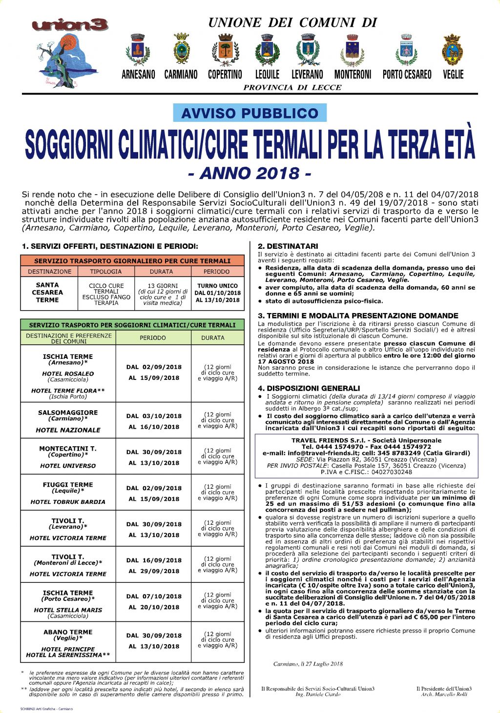 Si rende noto che - in esecuzione delle Delibere di Consiglio dell’Union3 n. 7 del 04/05/208 e n. 11 del04/07/2018 nonché della Determina del Responsabile Servizi SocioCulturali dell'Union3 n....