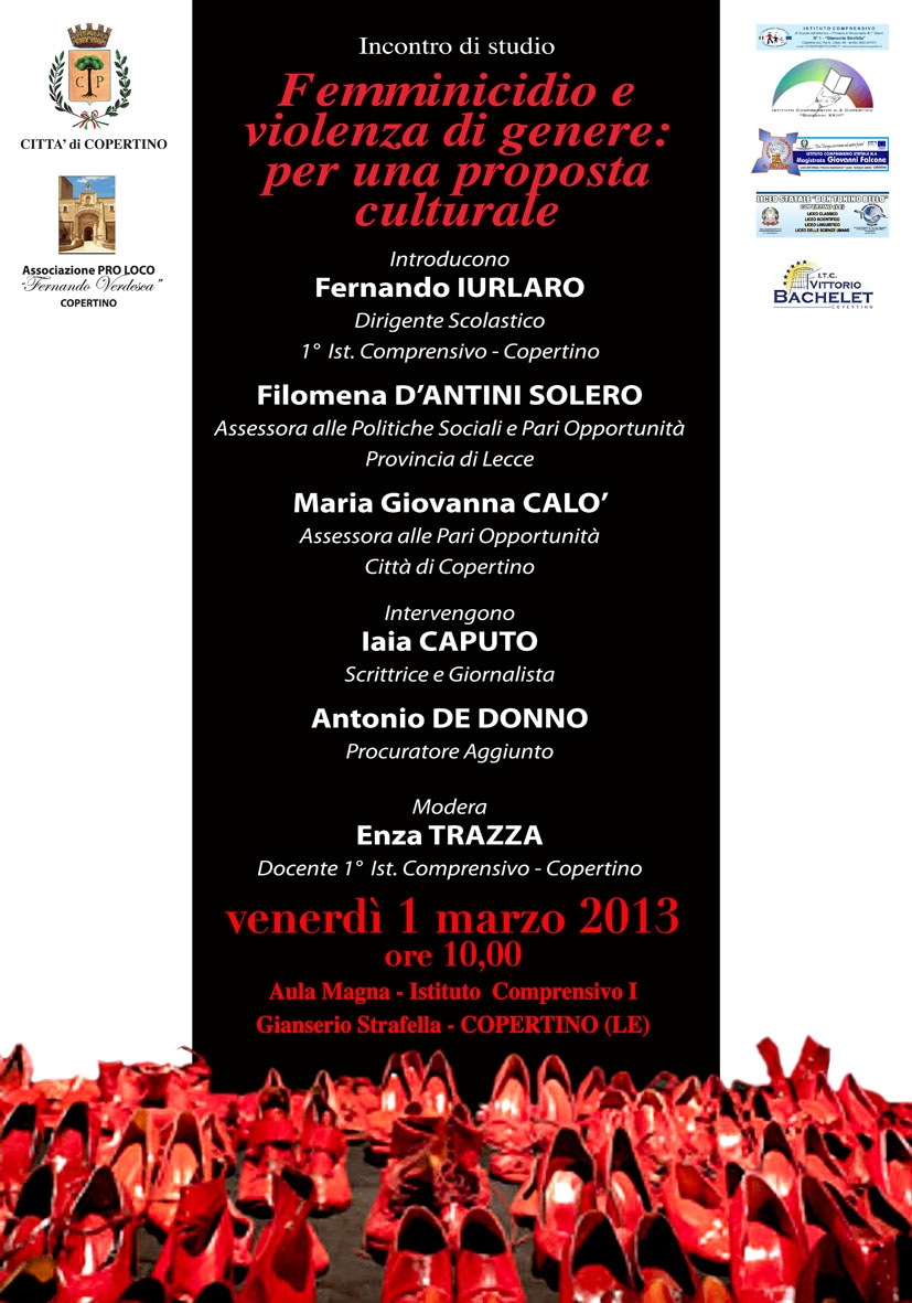 VENERDI'1 MARZO 2013 IN OCCASIONE DELLA FESTA DELLA DONNA SI SVOLGERANNO DEGLI INCONTRI CULTURALI SUL TEMA "FEMMINICIDIO E VIOLENZA DI GENERE:PER UNA PROPOSTA CULTURALE"