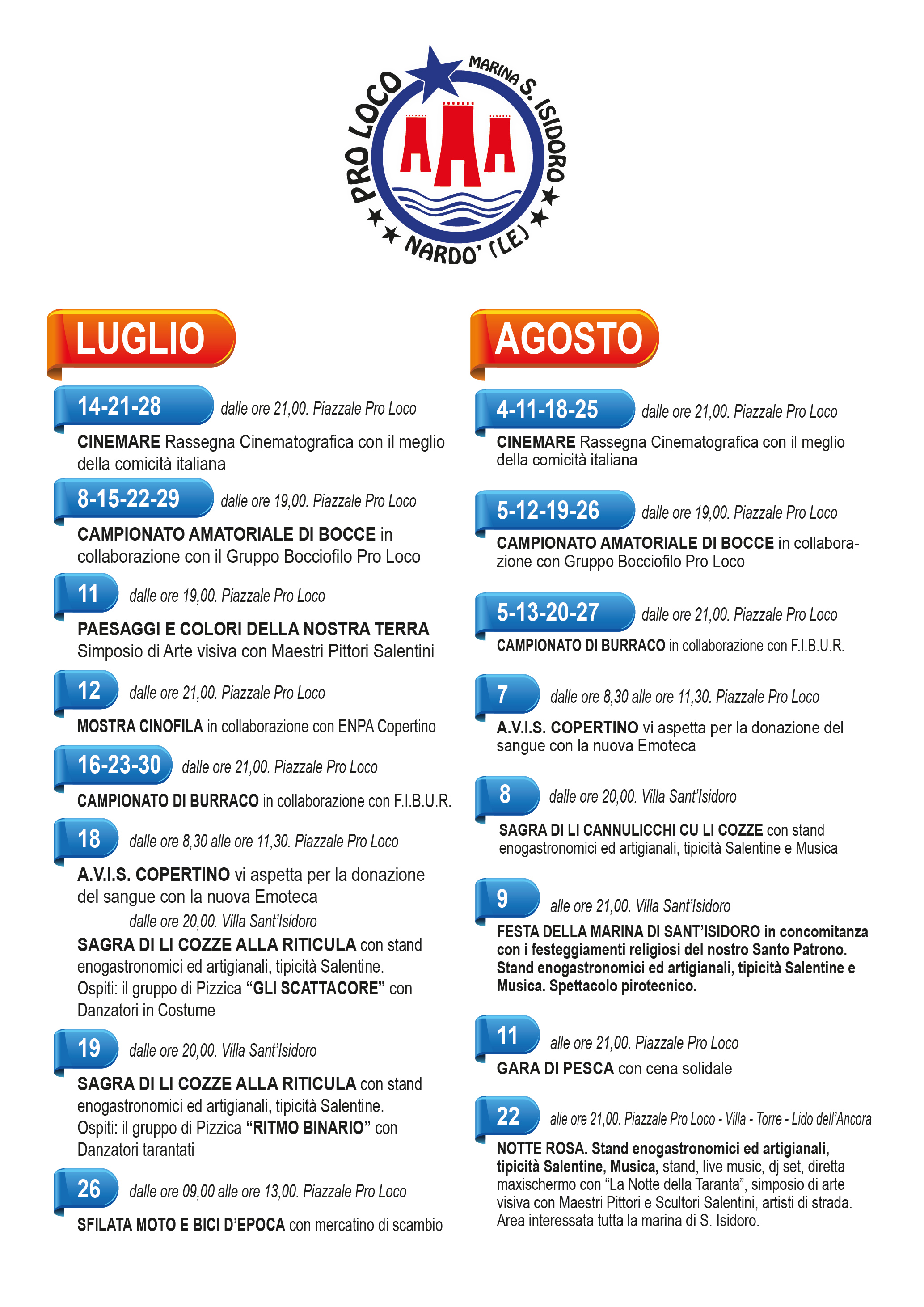 Venderdì 10 Luglio 2015, ore 19.00, presso la sede della Pro Loco di S. Isidoro, conferenza stampa presentazione programma estivo 2015 "VIVI S. ISIDORO". In allegato Comunicato stampa e Programma...